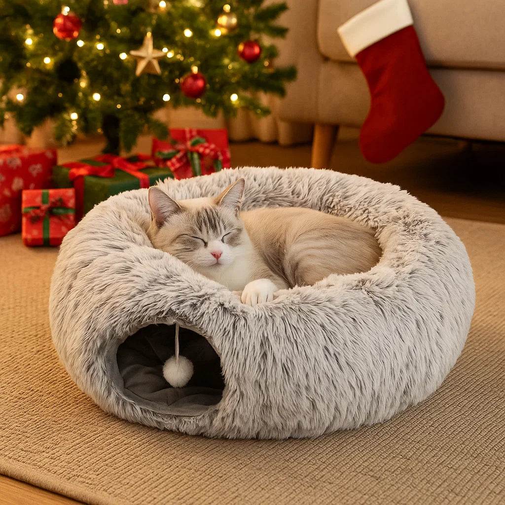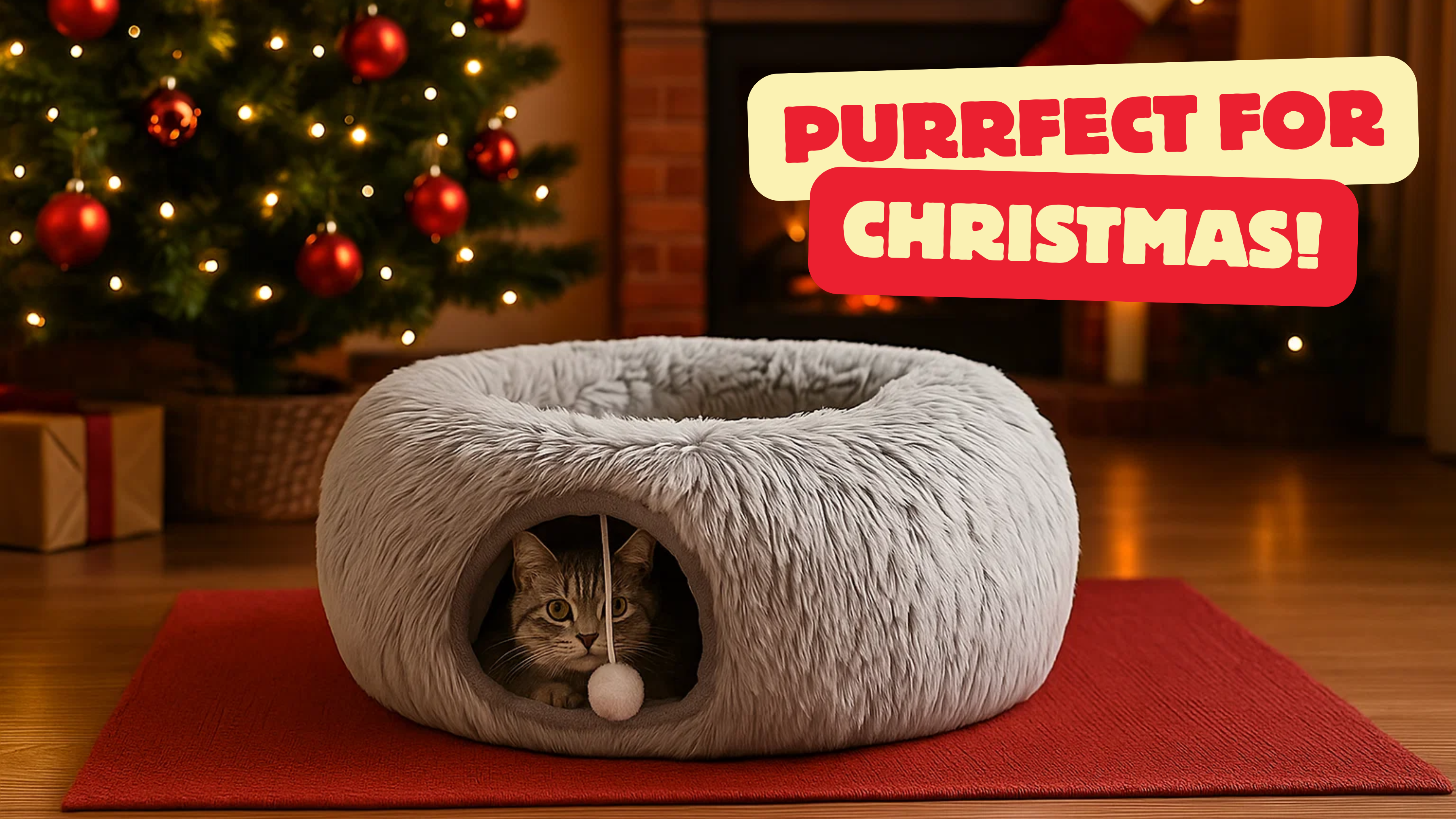 We designed this tunnel bed to be the perfect blend of softness, style, and holiday warmth. It keeps your cat entertained and comfortable while fitting beautifully under your Christmas tree.